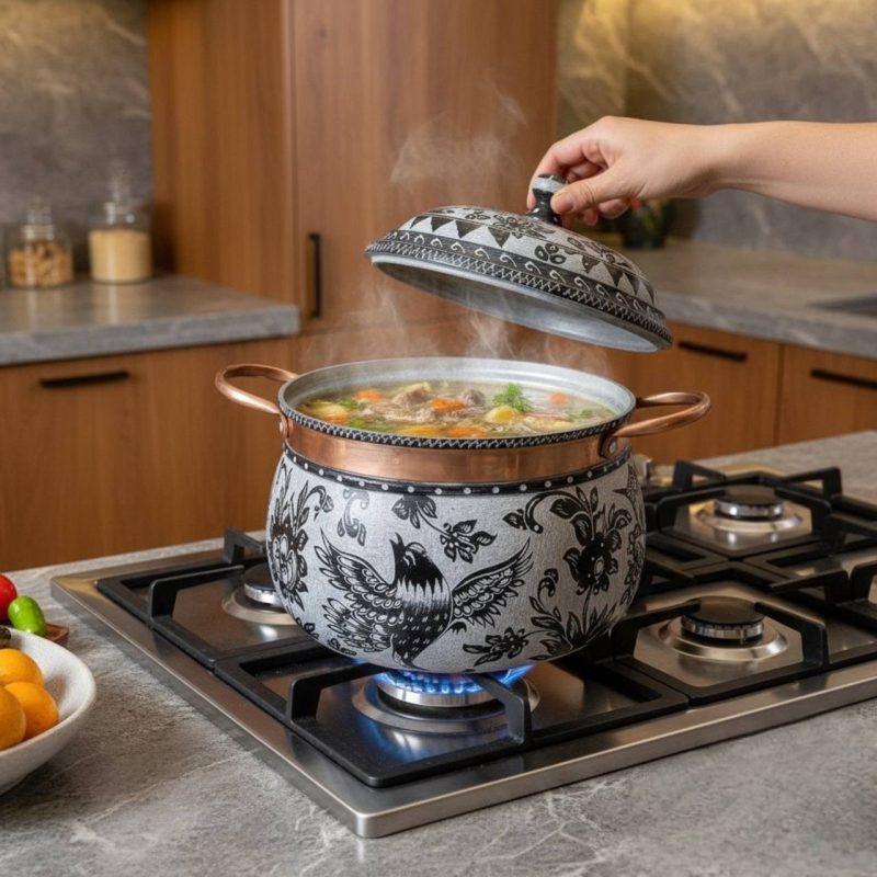 دیگ سنگی با دسته مس قلمزنی شده طرح گل مرغی