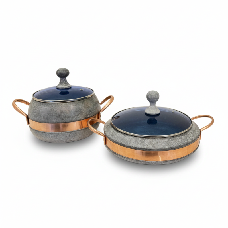 ست دیگ و تابه سنگی با دسته مس تراش صاف